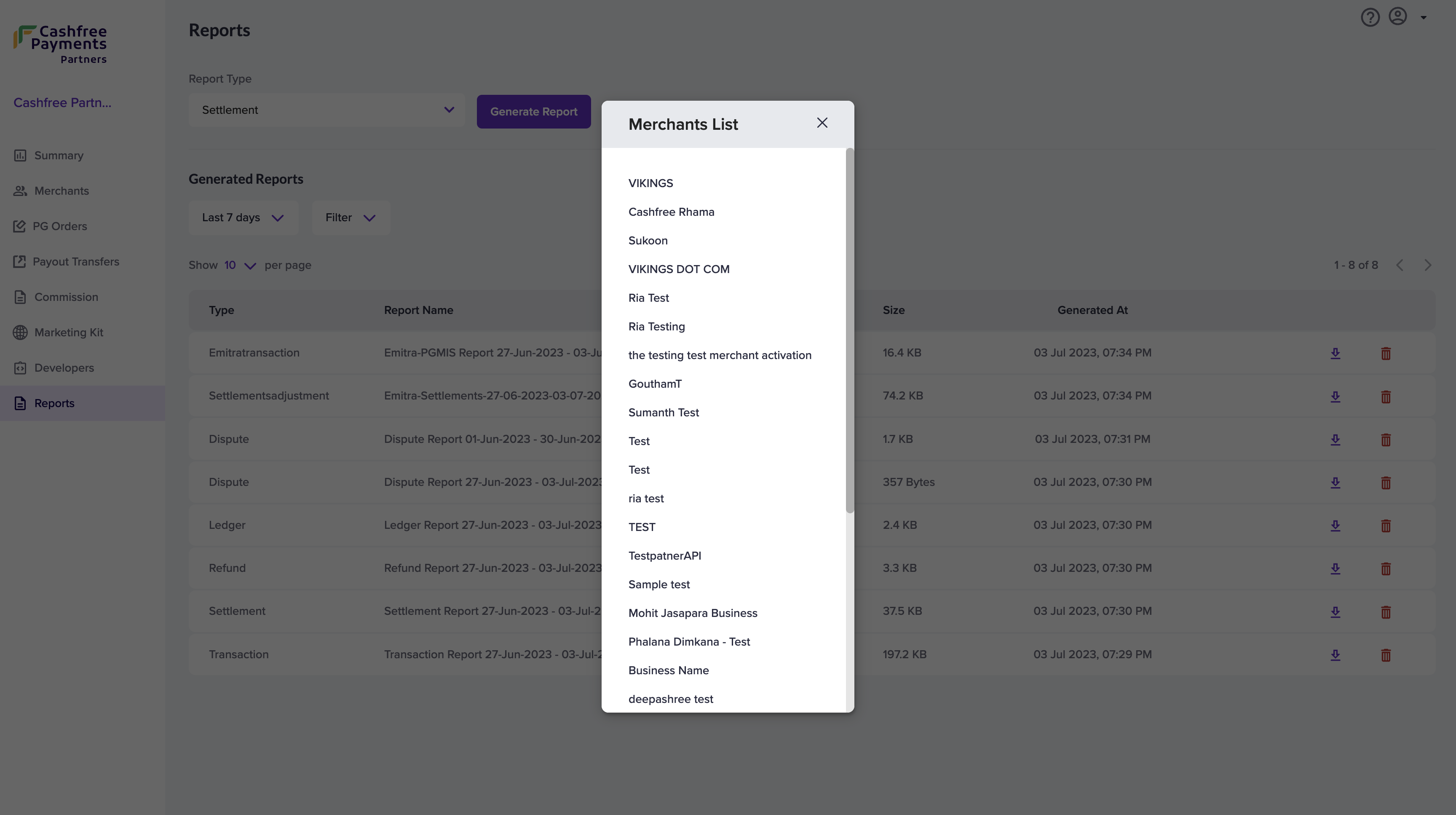 The Summary screen gives you details about your daily transactions, like the current-day transaction count, the value of the transactions made by your merchants, and the last commission amount you received from Cashfree Payments as per the referral program. The following details are available on this page -- Number of Transactions Today - Total number of PG and Payout transactions done by your merchants.