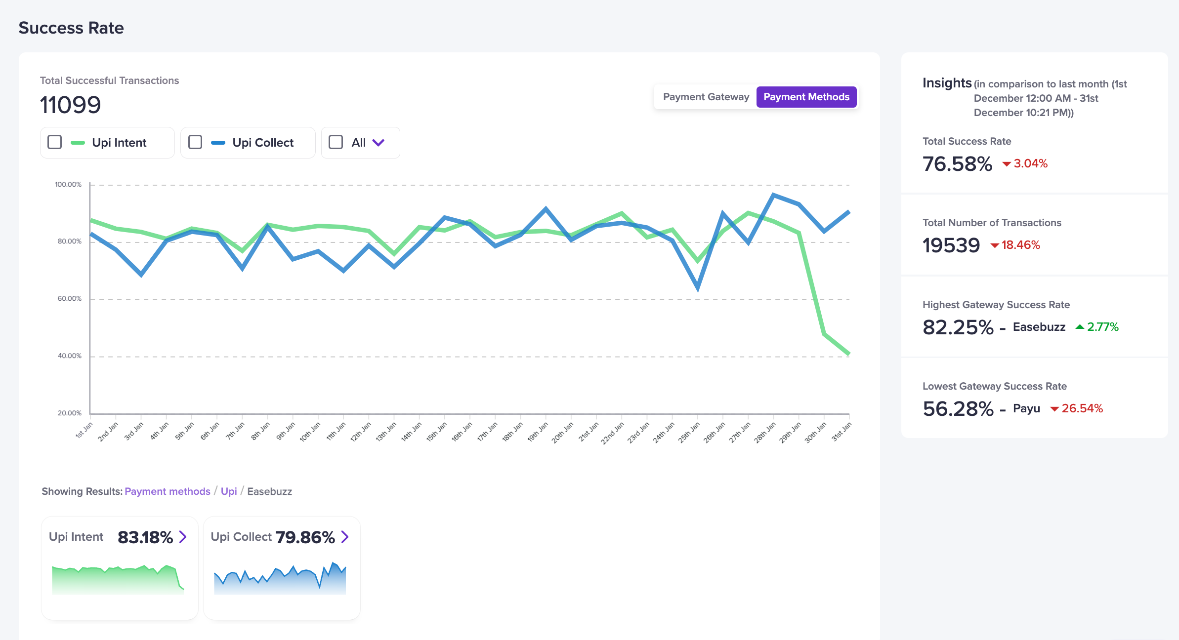 See which payment methods work best (e.g., UPI, card) and identify issues.