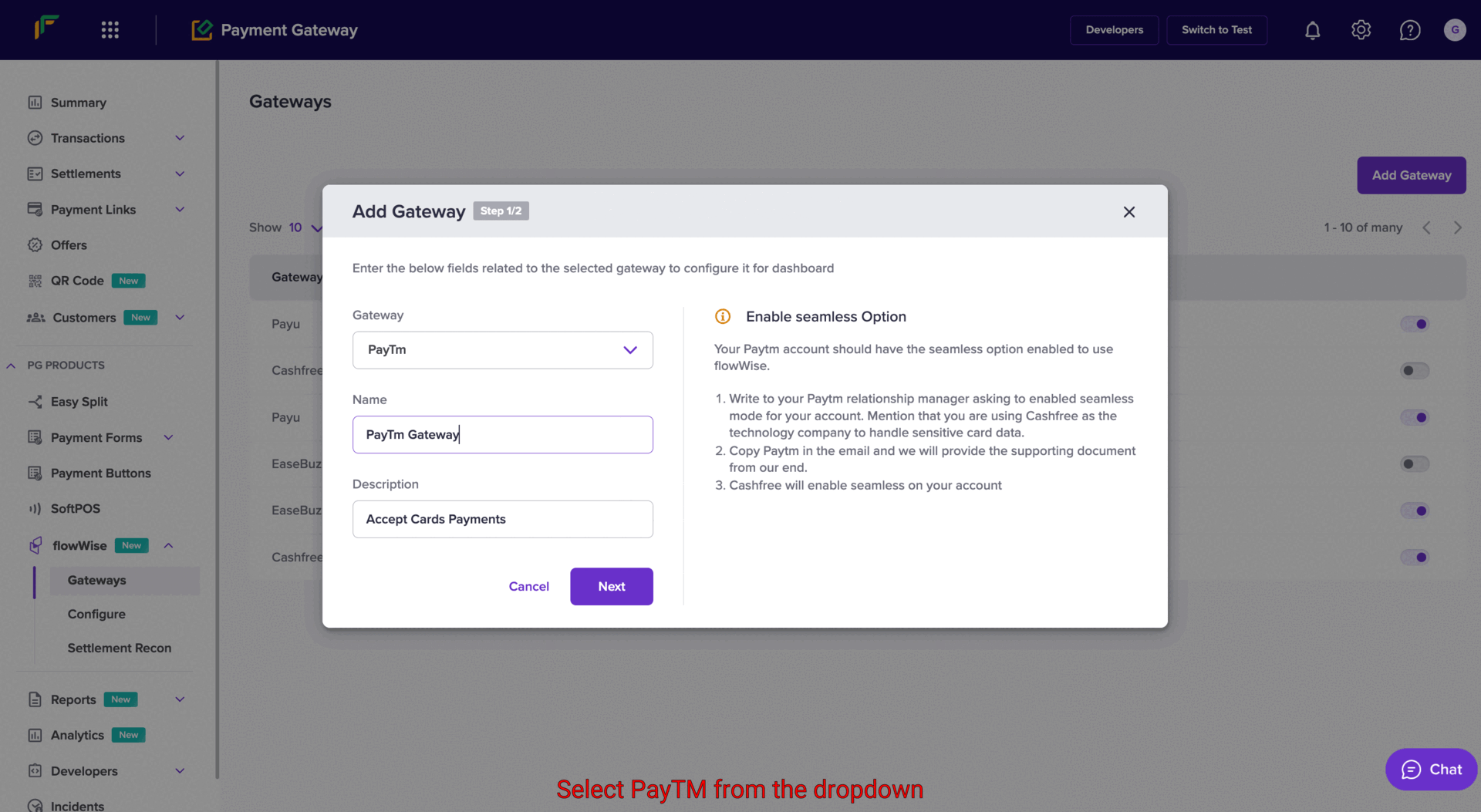 To be able to use PayTm on Flowwise, you will need to get the following items implemented for your PayTm account from your PayTm Account Manager:- Enable seamless mode for your account. Mention that you use Flowwise (Cashfree) as the technology service provider (TSP) to handle sensitive card data.