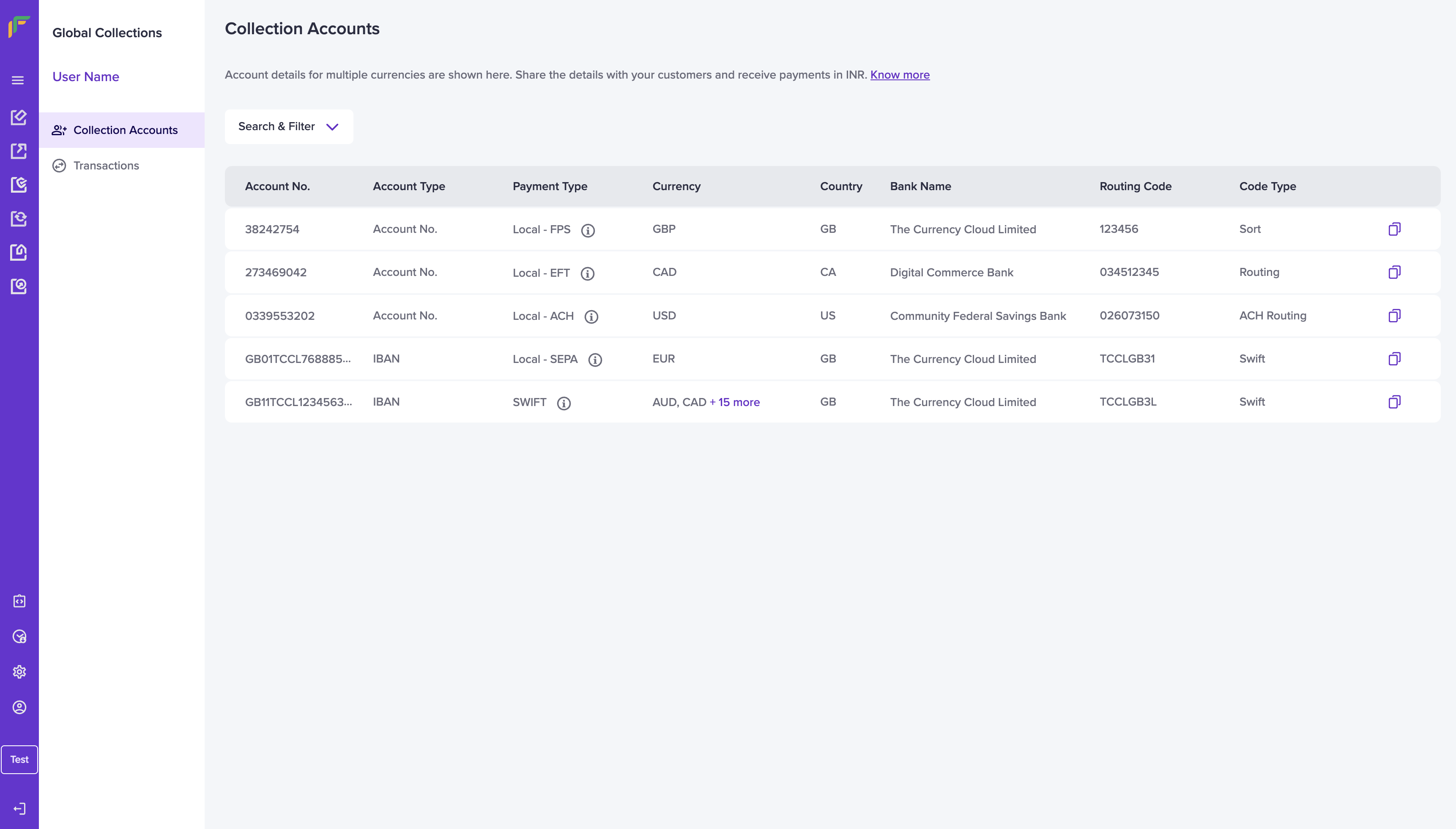 - Currency - This represents the currency supported for the corresponding collection account. We use standard ISO codes to refer to the currency.
