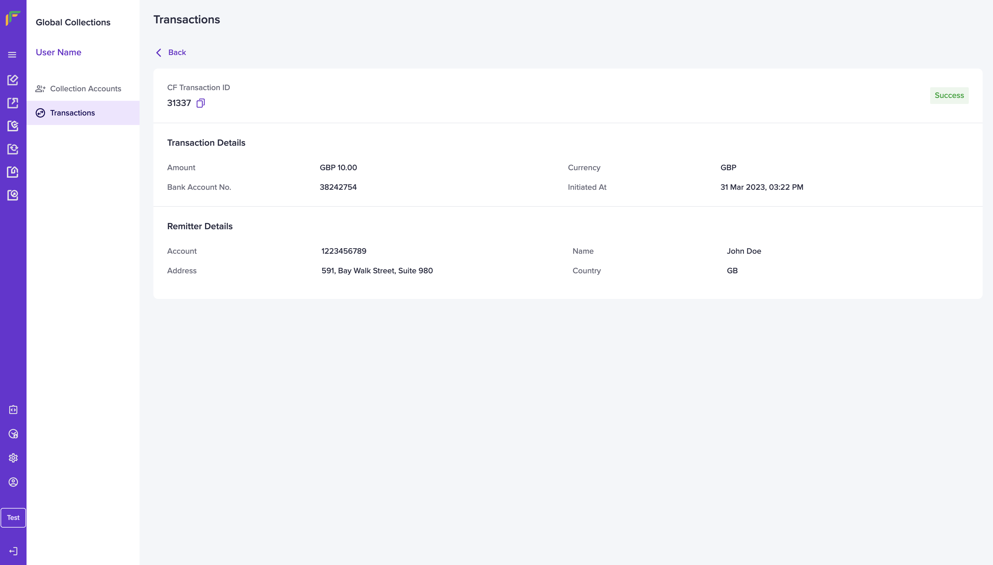 Click on a transaction to view the complete details of the transaction along with the remitter details.