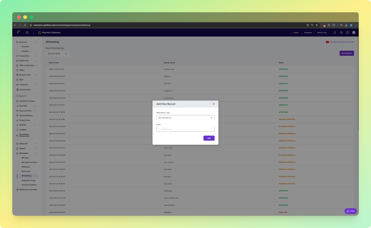 - Go to Payment Gateway Dashboard > Developers > Whitelisting.