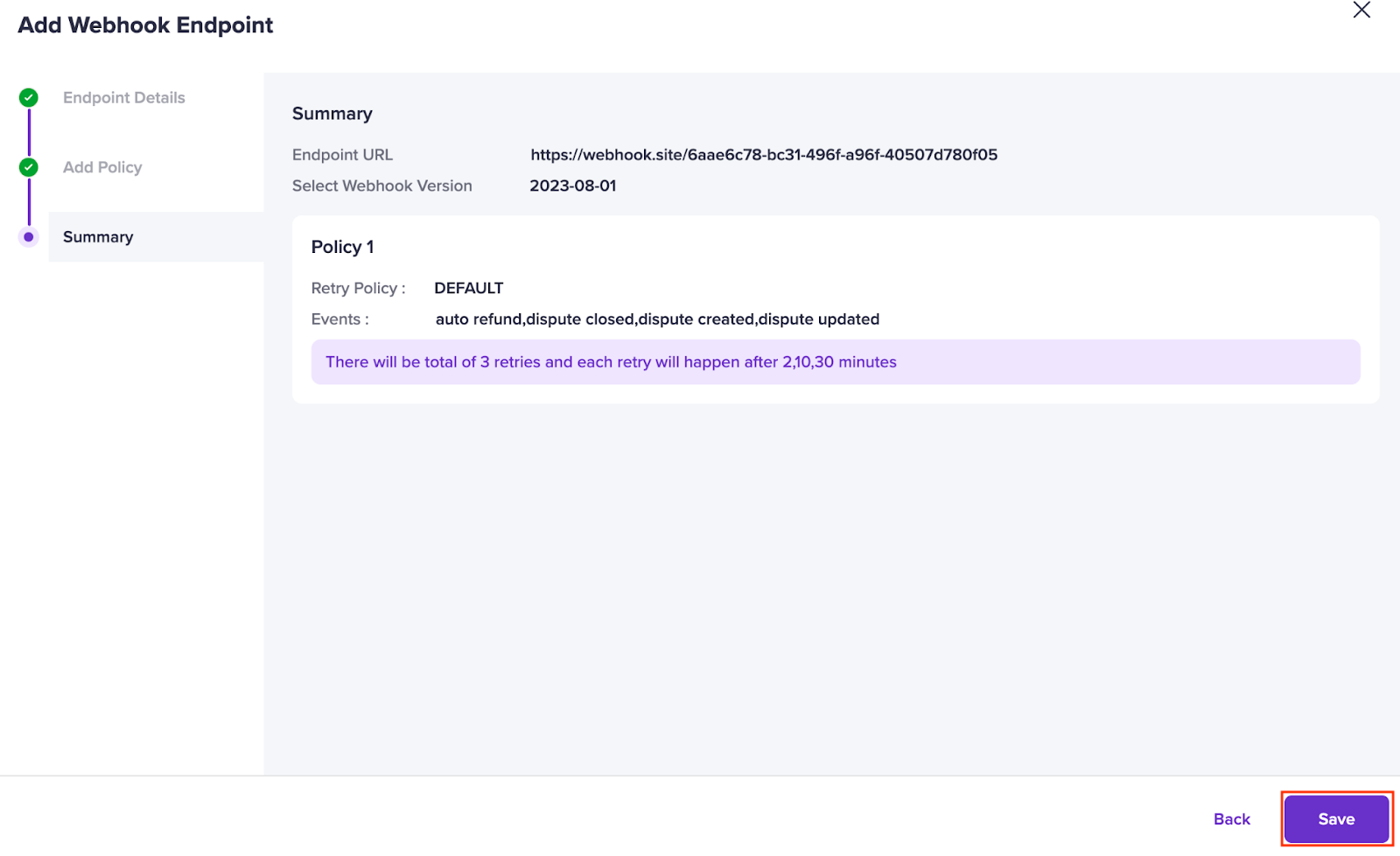 request to check if it is valid and responsive. If the endpoint does not respond, select Continue and manually choose the required events.- Add Policy: Customise the retry policy and select the webhook events you want to subscribe to.