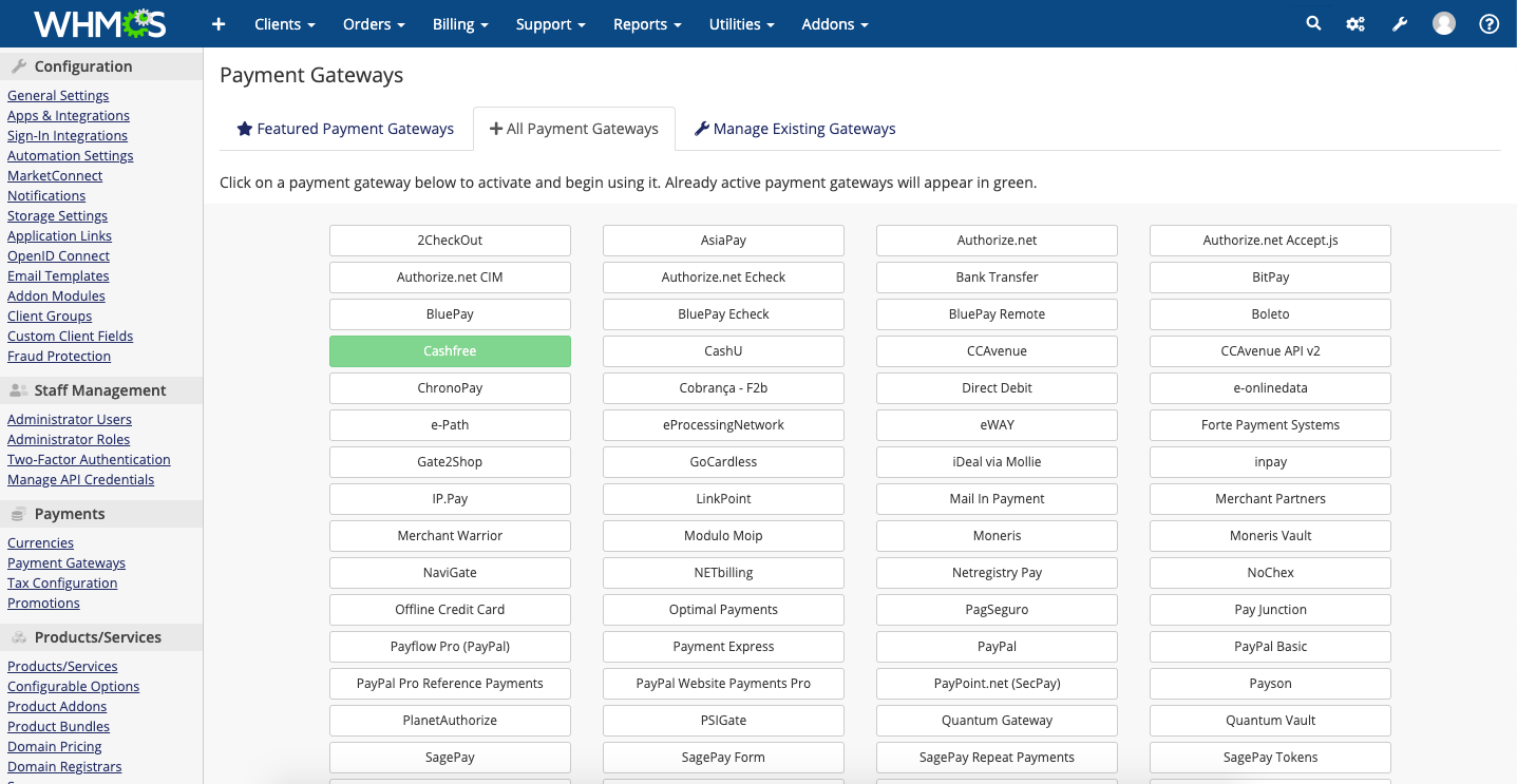 In the WHMCS Admin Dashboard, go to Setup > Payment Gateways > All Payment Gateways, and select Cashfree from the list and activate it.