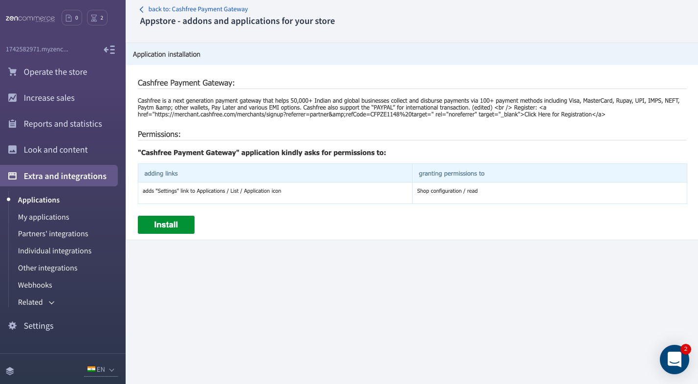 - In the Cashfree Payment Gateway applications section, click Install.