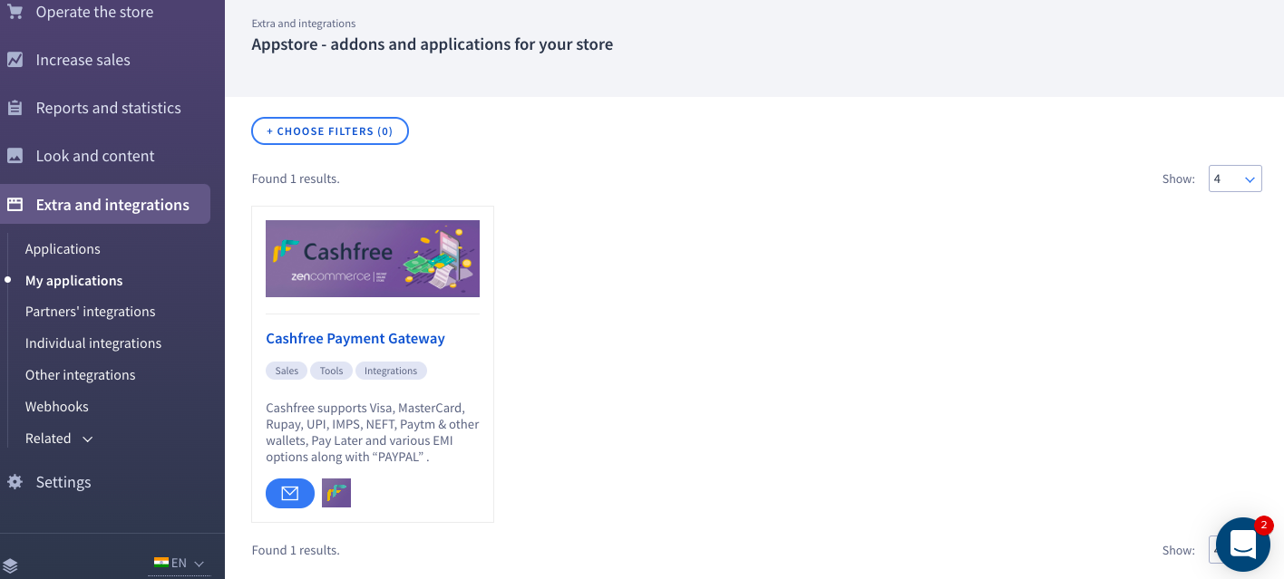 To add Cashfree Payment Gateway to your Zencommerce account,- Log in to your Zencommerce account and click Extras and Integrations in the left navigation section.