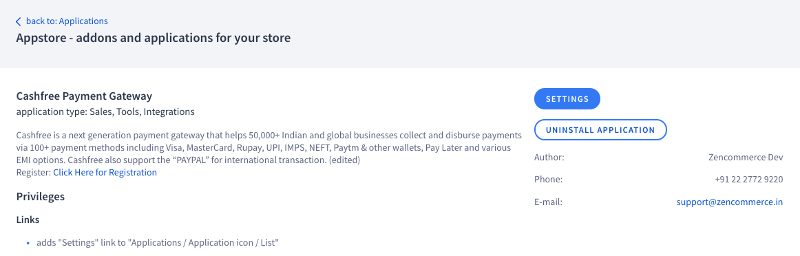 Installed Cashfree Payment Gateway Application