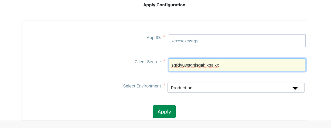 In the Apply Configuration screen, enter the App ID and Client Secret for your Cashfree Payments account. Select Production or Test as the environment and click Apply.