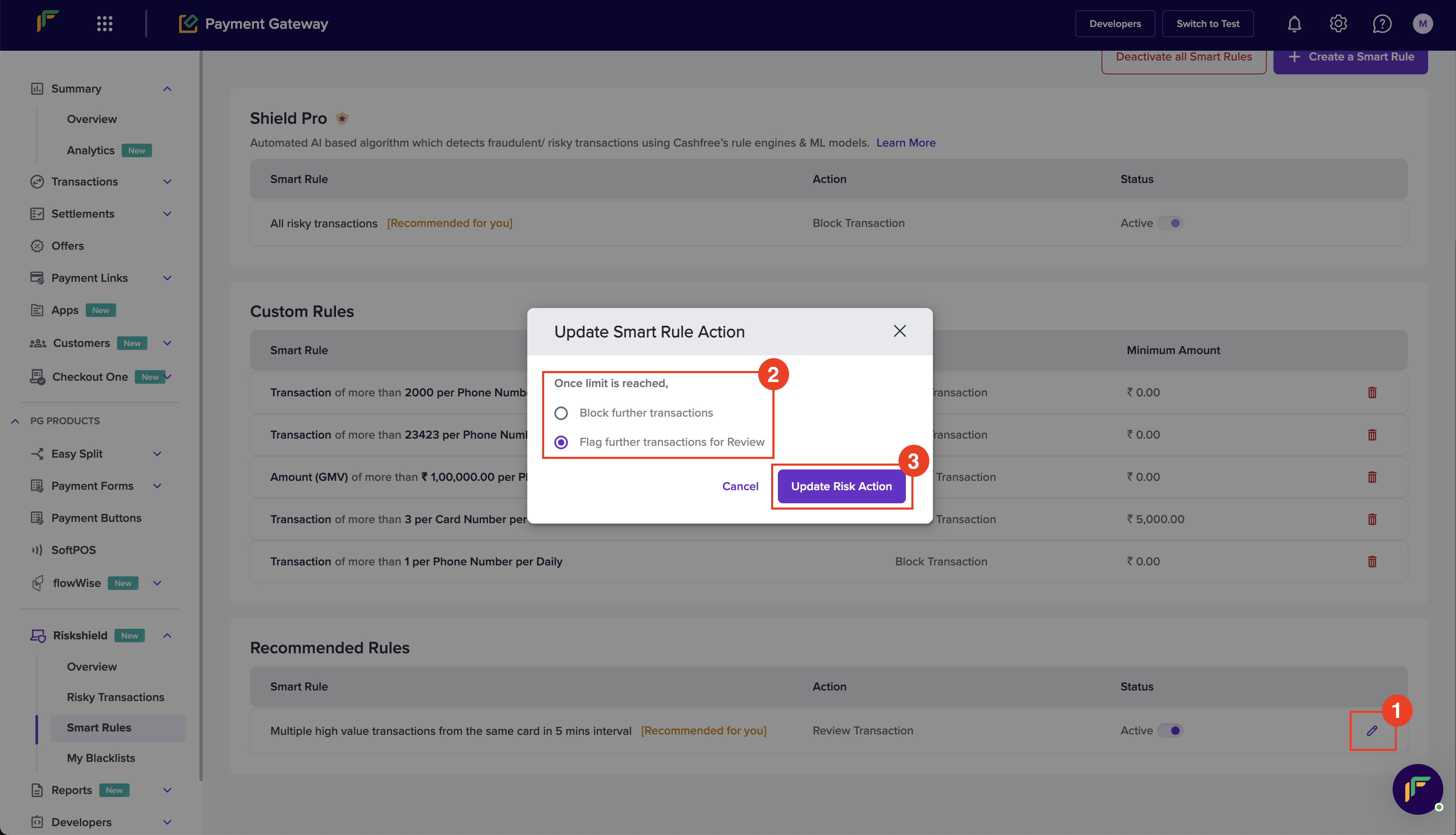 You can choose to block or flag the transactions for review that fall under the recommended rules.- From the Smart Rules screen, click the Edit icon under Recommended Rules for the rule you want to update.