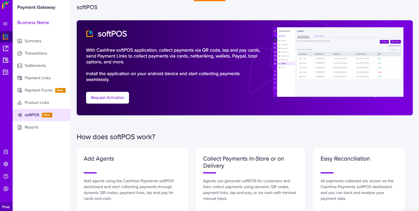 To use the SoftPOS application, ensure you have signed up with Cashfree Payments and your Payment Gateway account is active. To activate softPOS,- Go to Payment Gateway Dashboard > click softPOS. You will see a screen as shown below: