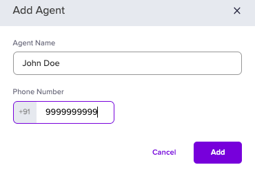 - In the Add Agents screen, enter the Agent Name and Phone Number.