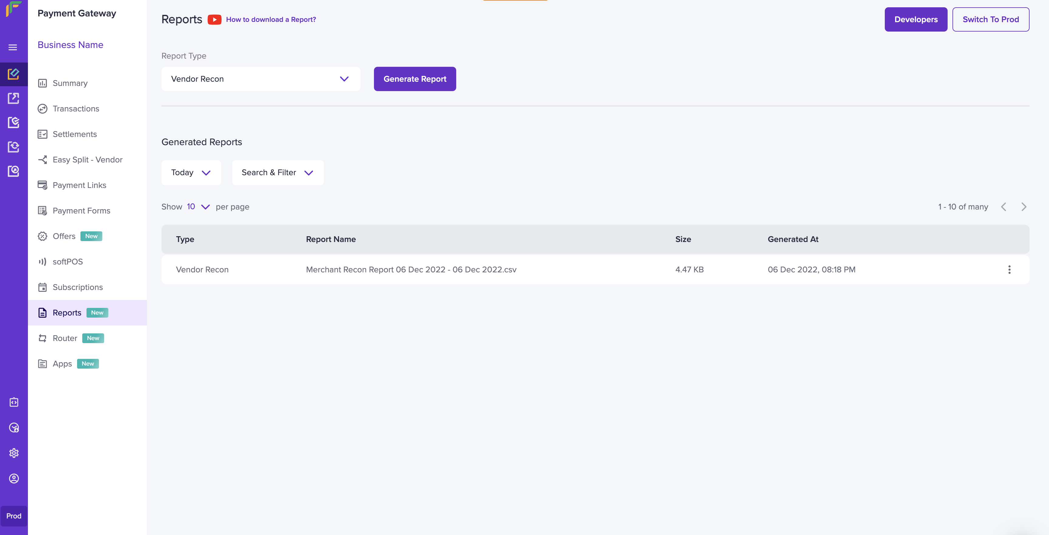 - Select the vendor recon report type, date range, file format, and provide the file name. Click Generate Report.