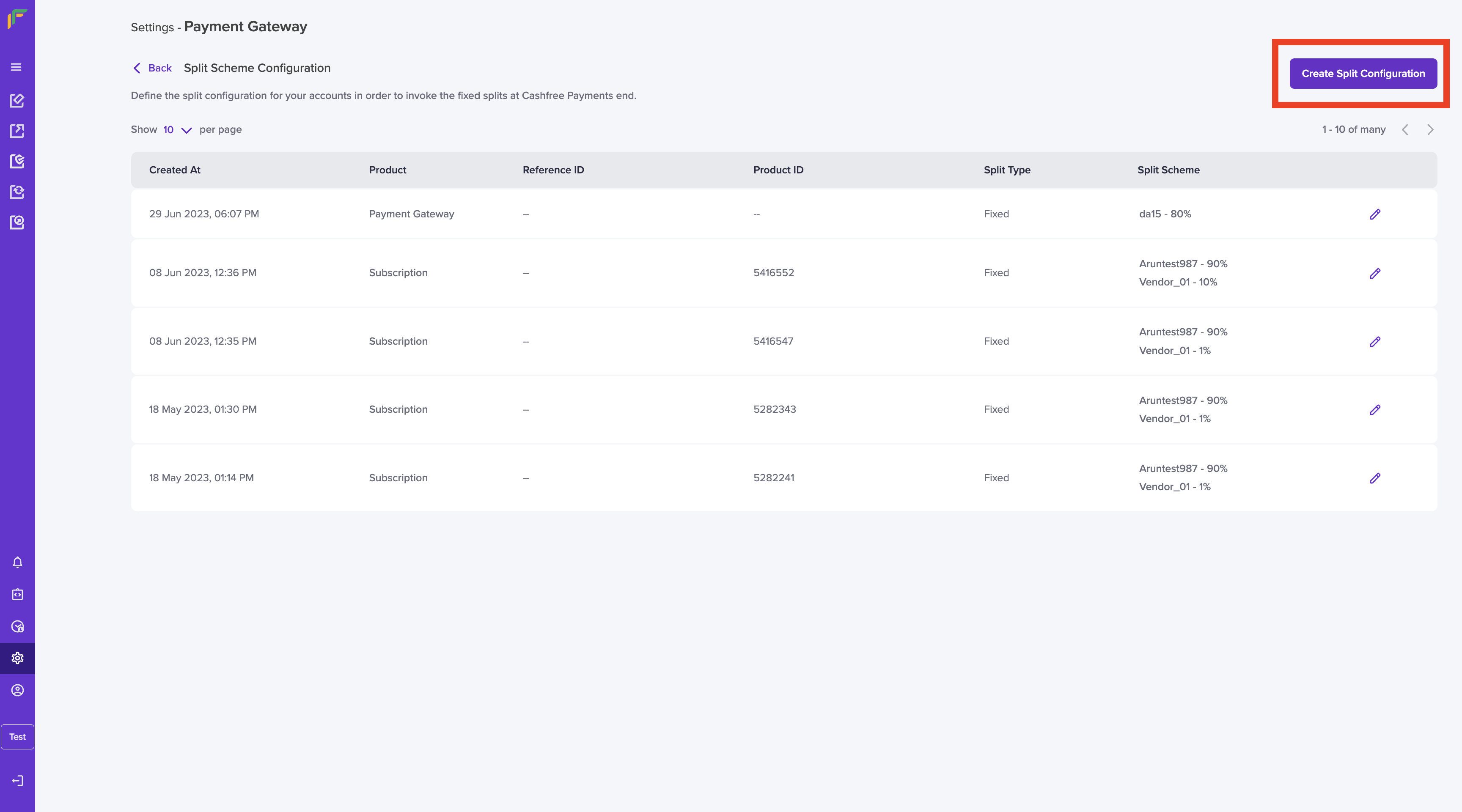 - Go to Payment Gateway Dashboard > Settings > Split Scheme Configuration. All the splits schemes you have created will be displayed on this page along with the other details such as: