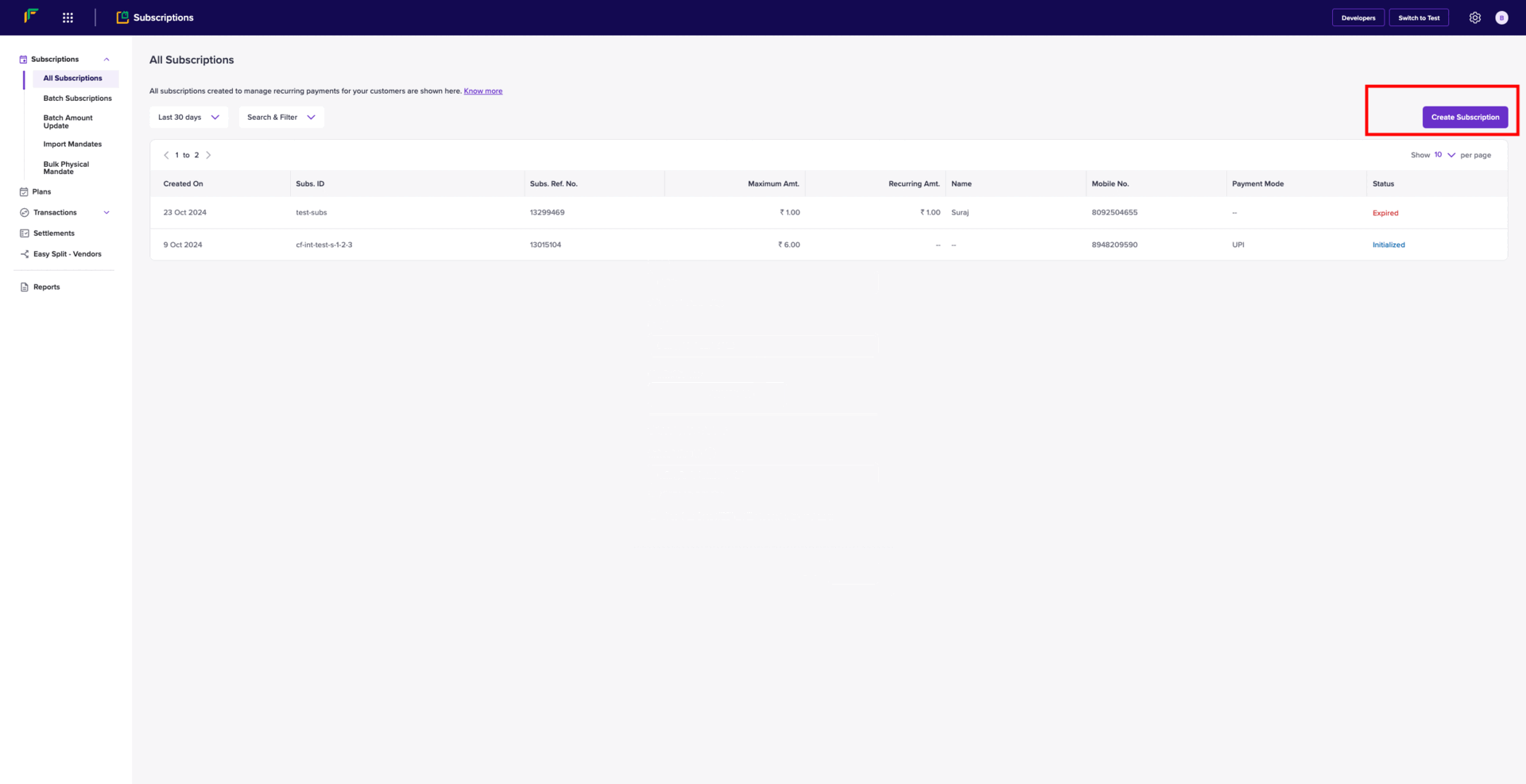 BANK APPROVAL PENDING | The customer authorises the subscription, but the bank confirmation is still pending. This applies to NACH. It may take 24-48 hrs to change the status from BANK APPROVAL PENDING to ACTIVE |