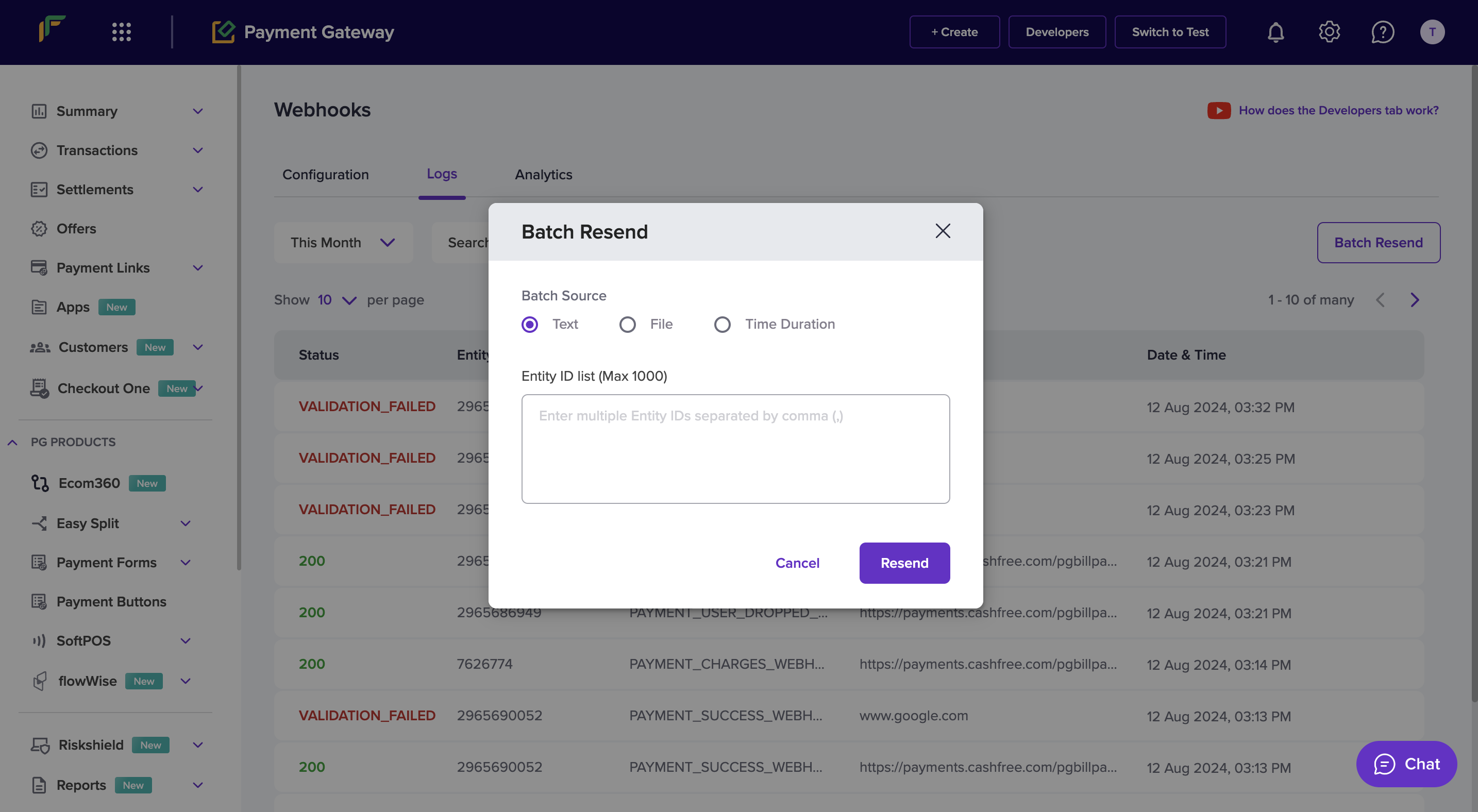 - File - upload the file in the required format (downloadable from the dashboard) with required Transaction IDs and click ‘Resend’
