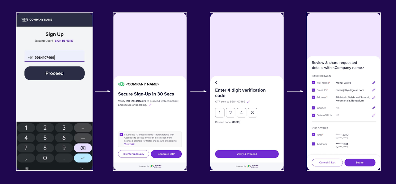 The following are the key reasons to choose Cashfree:- Improve conversions by over 30%: Reduce manual entry and friction by pre-filling forms with verified user data from over 15 sources, including PAN, masked Aadhaar, address, credit score, and more.