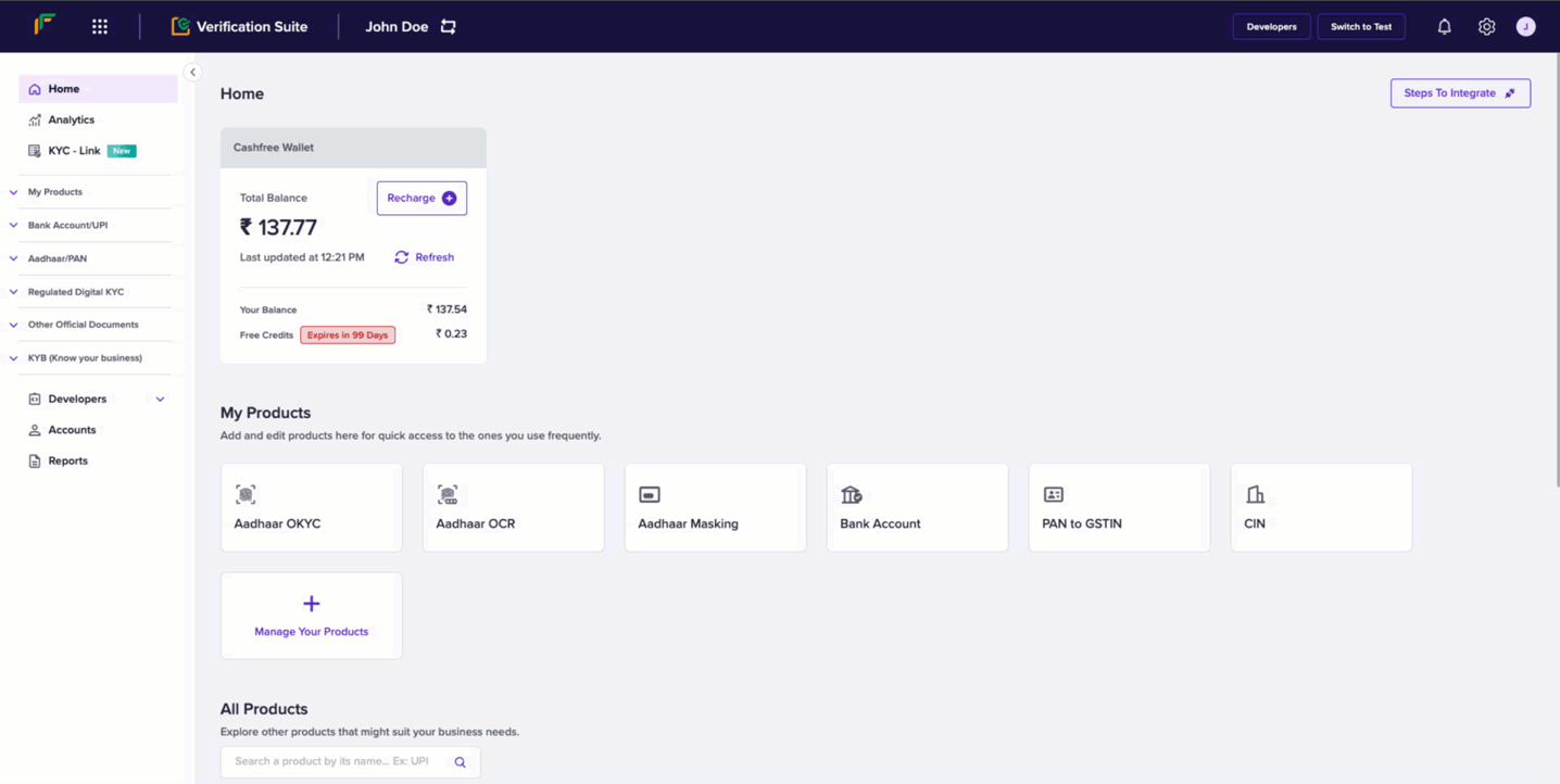 Follow these instructions to view the account details of your Cashfree Wallet:- Log in to your Verification Suite dashboard using your credentials.