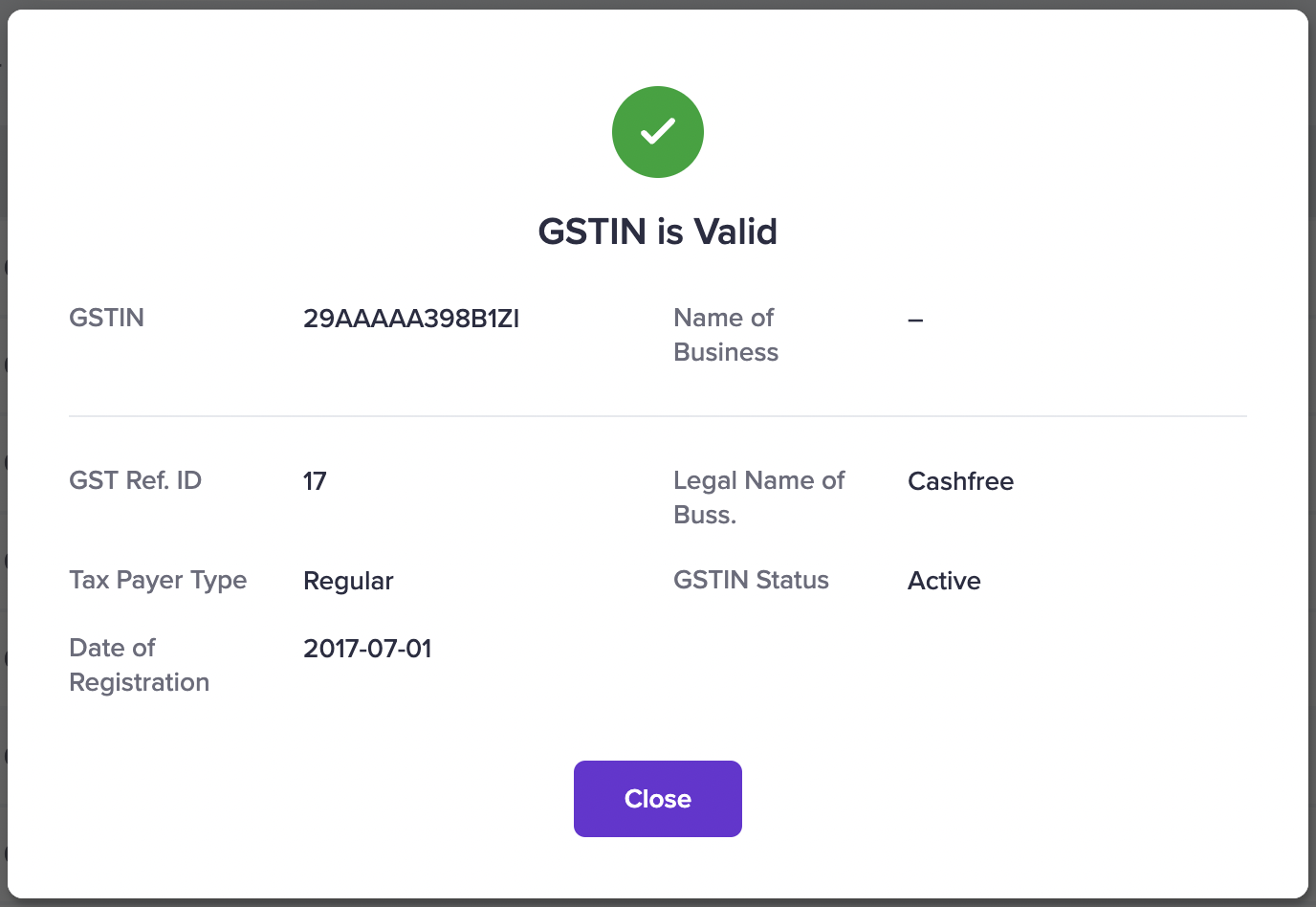 All you need to input is the 15-digit GSTIN number of the business and you will get an instant verification status and other business details.
