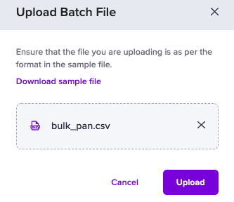 When you have a large number of PAN to be verified, you can upload a single file with all the details to verify them in one go. To verify all the PAN, you must upload a .csv, .xls, or a .xlsx file that contains the PAN and name of an individual or business you want to verify. Download the sample file to know how the details must be filled in the file. To upload a batch file with PAN details,- Go to Verification Suite Dashboard > Batch > click Upload File.