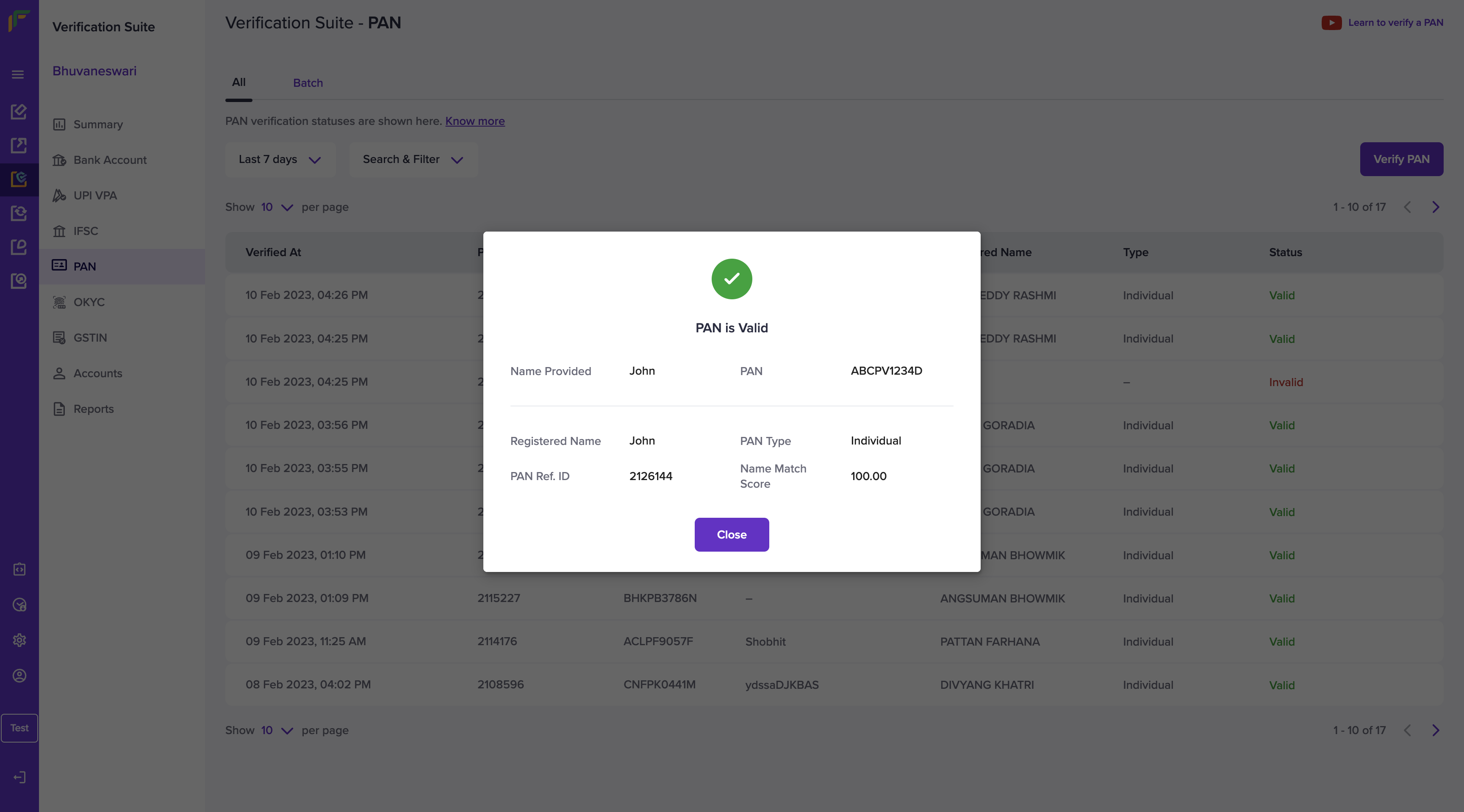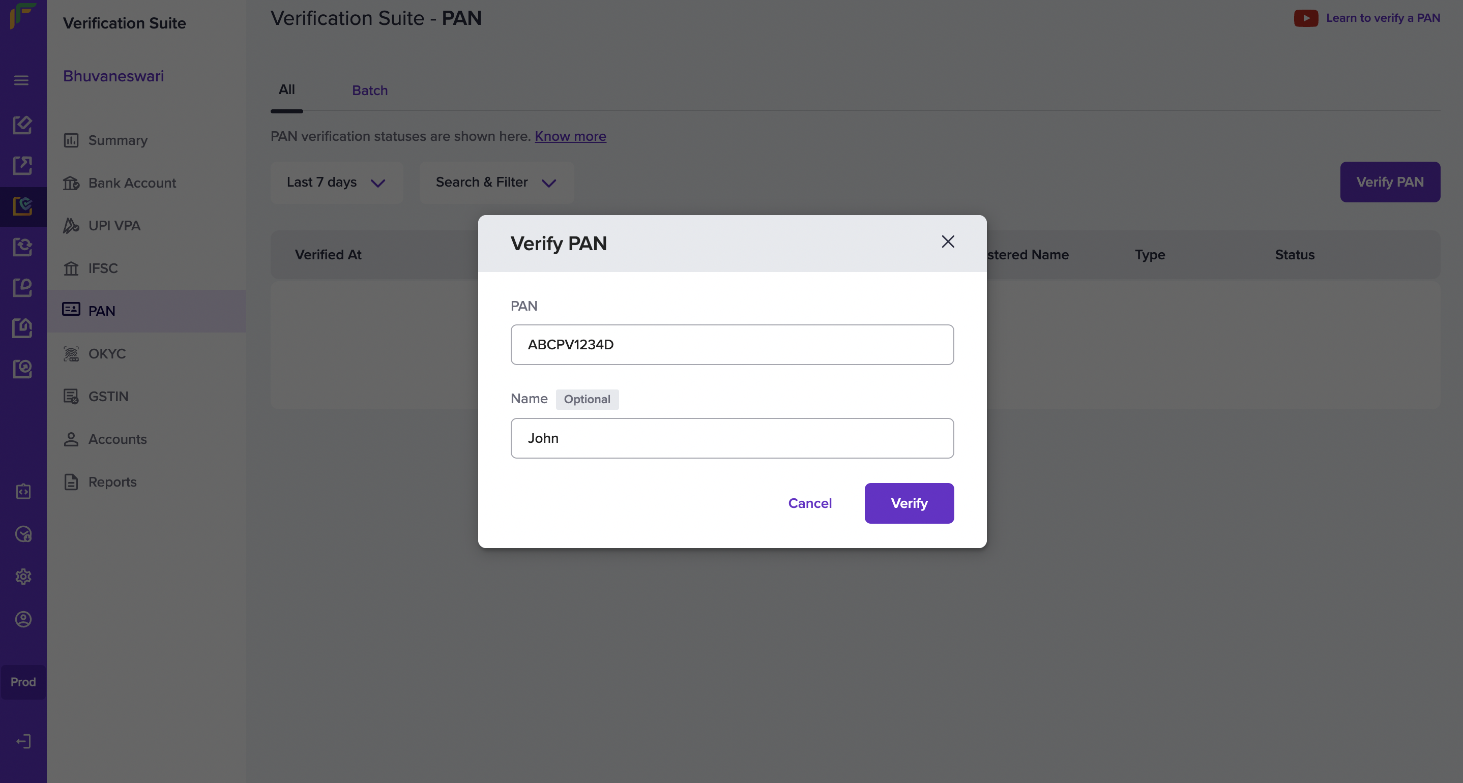 To verify PAN,- Go to Verification Suite Dashboard > PAN > click Verify PAN.